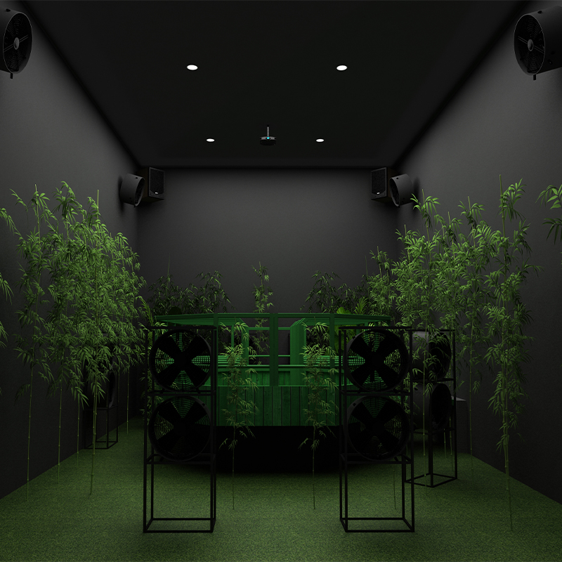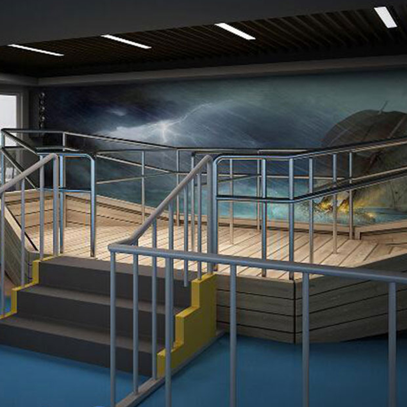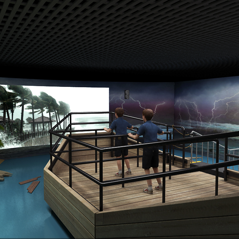 臺風(fēng)館采用先進(jìn)的多媒體技術(shù)以及和實景相結(jié)合的逼真效果來模擬臺風(fēng)發(fā)生時的情景。